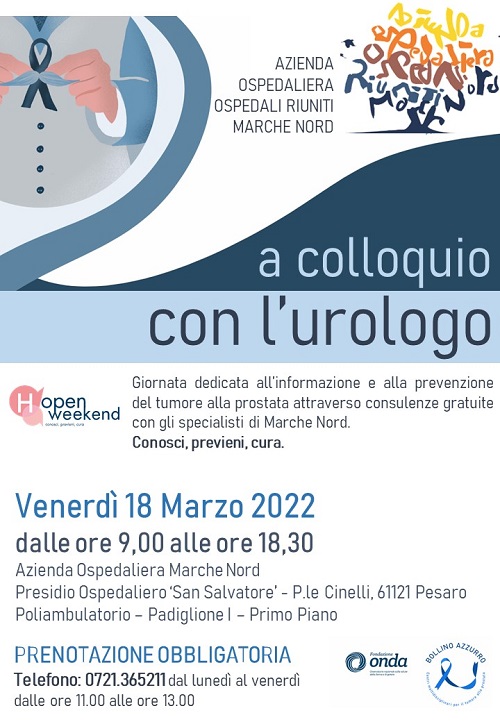 Per partecipare al colloquio individuale con lo specialista urologo è necessario prenotarsi al numero 0721.365211, attivo dal lunedì al venerdì dalle 11 alle 13. I colloqui si svolgeranno nell’Ambulatorio di Urologia del Poliambulatorio del presidio ospedaliero San Salvatore di Pesaro (stabilimento centrale in Piazzale Cinelli), Padiglione I – primo piano.