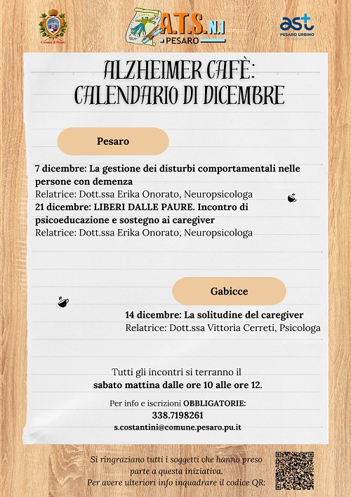 Nuovi incontri a dicembre con l’Alzheimer Cafè. Si parte il 7 Dicembre 2024 da Pesaro, nel “Centro socio-culturale Adriatico” (Viale Trieste 242), con “La gestione dei disturbi comportamentali nelle persone con demenza”, incontro moderato dalla neuropsicologa Dott.ssa Erika Onorato; segue nuovo appuntamento il 21 Dicembre 2024, sempre a Pesaro, con “Liberi dalle Paure: incontro di psicoeduzione e sostegno ai caregiver”.
