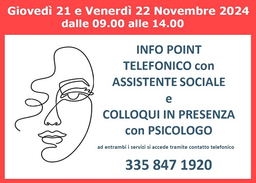 - Sportello di ascolto telefonico rivolto ai cittadini e alle cittadine dal 25 al 29 novembre 2024: si tratta di un servizio di ascolto gratuito telefonico per le donne, per i loro familiari o per gli operatori che vogliano acquisire maggiori informazioni su eventuali percorsi di uscita dalla violenza attraverso la rete e dei servizi rivolti agli uomini presunti autori di violenza. Contattare i numeri, dal 25 al 29 novembre 2024 dalle 9 alle 11, 0721.882510 e 0721.362944.