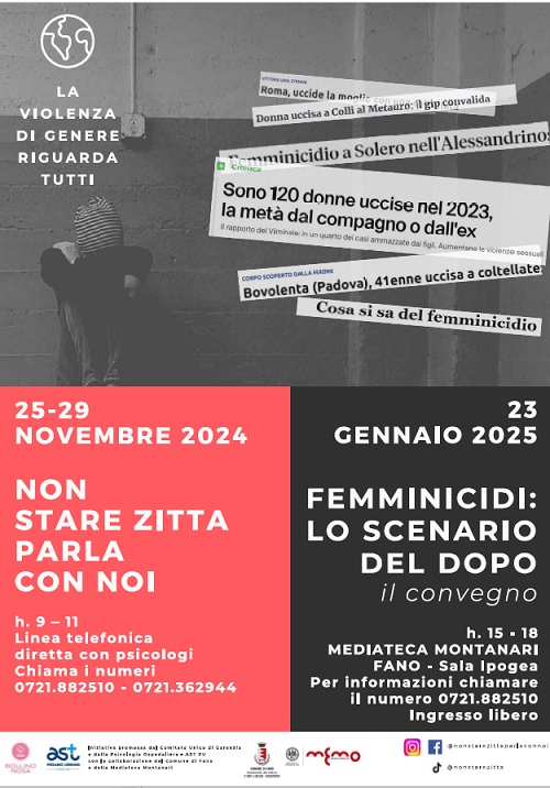 Sempre nell’abito delle iniziative legate alla Giornata Internazionale contro la violenza sulle donne, è in programma il convegno dal titolo “Femminicidi: lo scenario del dopo” il giorno giovedì 23 gennaio 2025 dalle ore 15 alle ore 18 alla Mediateca Montanari, convegno realizzato in collaborazione con il Comune di Fano e la Mediateca Montanari. Ingresso libero