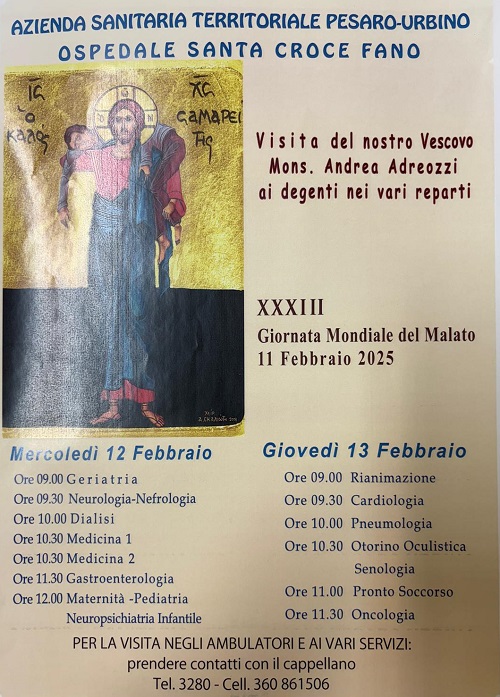 In occasione della XXXIII^ della Giornata Mondiale del Malato, tornano gli appuntamenti dedicati ai degenti. Monsignor Andrea Andreozzi il 12 e 13 febbraio 2025, visiterà operatori sanitari e pazienti ricoverati dell’Ospedale Santa Croce di Fano con il seguente programma, a partire dalle ore 9: