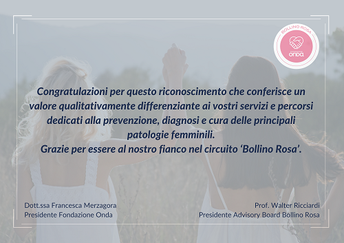 Fondazione Onda ha assegnato “l’undicesima edizione dei Bollini Rosa, che ha il patrocinio di 31 enti e società scientifiche – afferma Francesca Merzagora, Presidente Fondazione Onda – rinnova il nostro impegno nella promozione di un approccio gender-oriented all’interno delle strutture ospedaliere, riconoscendo l’importanza di servizi e percorsi a misura di donna, in tutte le aree specialistiche, che si distinguano per la qualità e l’appropriatezza delle prestazioni erogate. Gli Ospedali premiati con il Bollino Rosa vengono valutati alla luce dei percorsi inerenti sia alle specialità con maggior impatto epidemiologico nell’ambito della salute femminile, sia a quelle che trattano patologie che normalmente colpiscono entrambi i generi, ma con un approccio personalizzato. Vengono inoltre tenute in considerazione l’accoglienza e l’accompagnamento alle donne e i servizi offerti per la gestione di vittime di violenza. I 367 ospedali premiati costituiscono una rete di scambio di esperienze e di prassi virtuose, un canale di divulgazione scientifica per promuovere l’aggiornamento dei medici e degli operatori sanitari. Allo stesso tempo gli ospedali con il Bollino Rosa rappresentano per la popolazione, l’opportunità di poter scegliere il luogo di cura più idoneo alle proprie necessità, nonché di fruire di servizi gratuiti in occasione di giornate dedicate a specifiche patologie, con l’obbiettivo di sensibilizzare e avvicinare a diagnosi e cure appropriate».