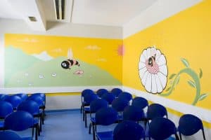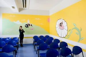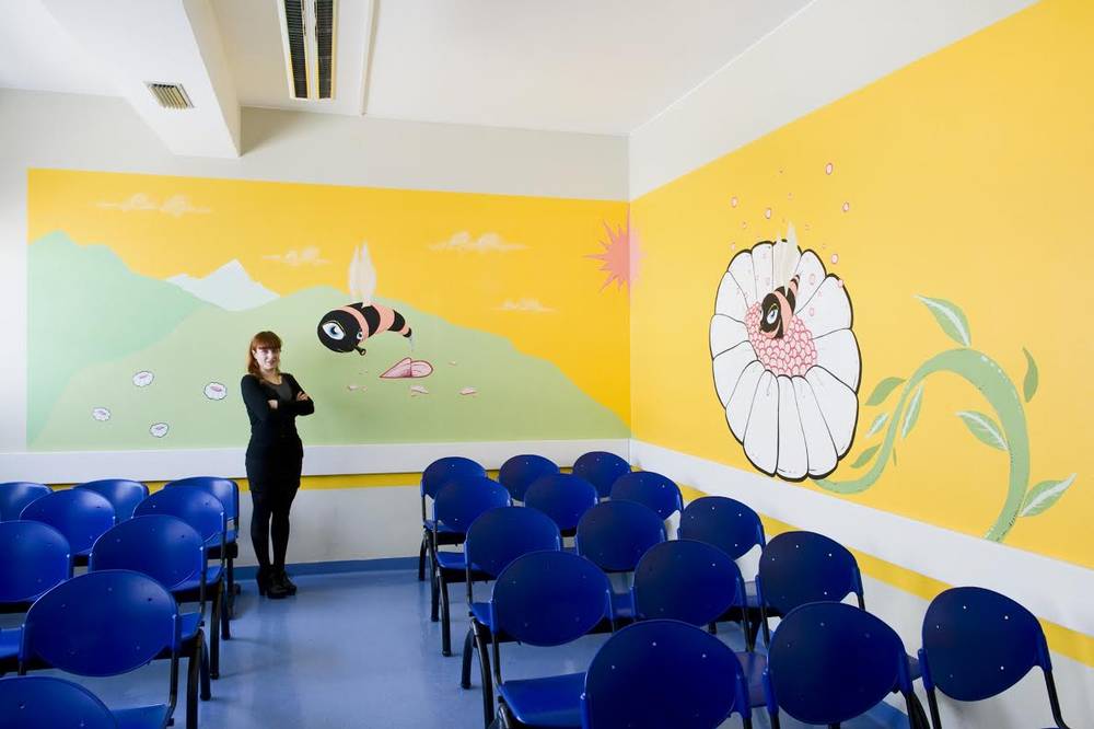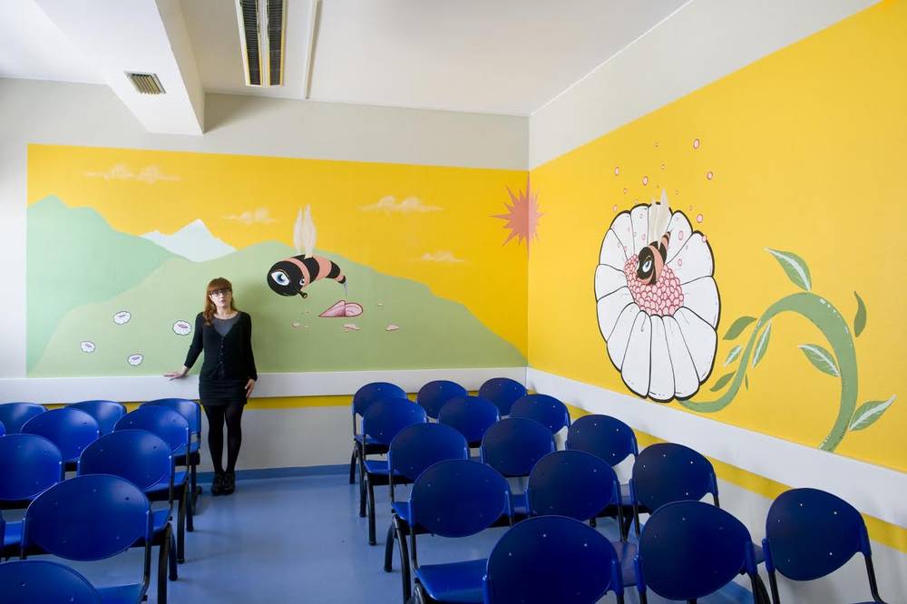 Attraverso un grande murales sviluppato su due pareti ad angolo, Laura Baldini interpreta lo spazio d’attesa della sala prelievi del laboratorio analisi.