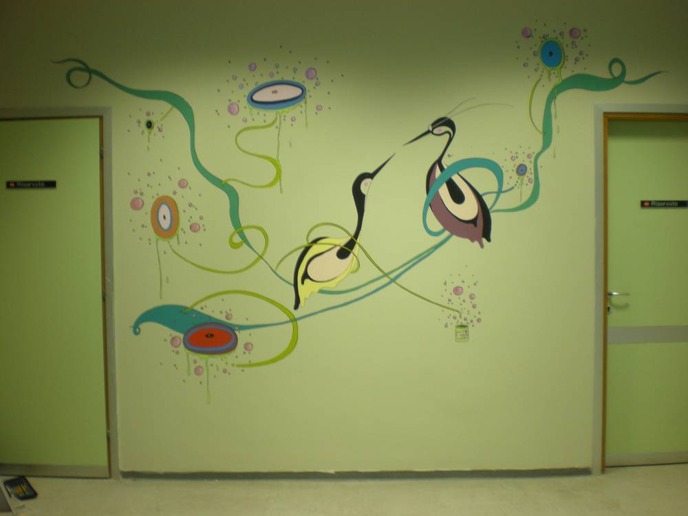 Sulle pareti giallo acido della Sala d’Attesa del Reparto di Oculistica si anima un sogno fatto forme labili dai colori forti, simili a leccornie e caramelle, elementi surreali che si immettono nella vita reale.