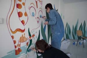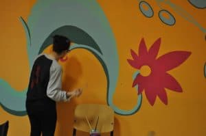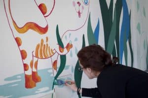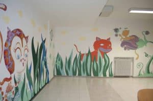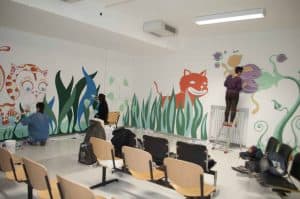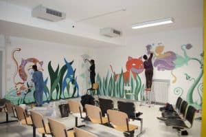 Un intervento artistico vivace e spumeggiante l’esteso murales realizzato a tante mani dal Collettivo Ruvida per il Poliambulatorio di Marche Nord. A Muraglia, le pareti della sala d’attesa, della rampa di scale e dell’ambiente delle casse sono ora vestite di fantastiche figure fiabesche che si muovono in una natura incantata.