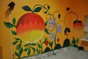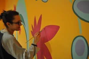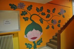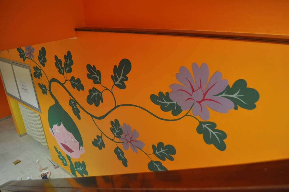 I disegni continuano anche sulle pareti della scala come a voler accompagnare l’utente al piano superiore. La scala mostra una figura vegetale che ricorda, nelle fattezze, un elfo, magico guardiano dei segreti della natura. I colori sono piatti, riempiti a larghe campiture da toni decisi: Il verde, il viola e l’arancio, sono i punti di forza di questa scelta cromatica, pensata dagli autori per ricordare una verve fumettistica che arricchisce il lavoro di vitalità e freschezza estetica.