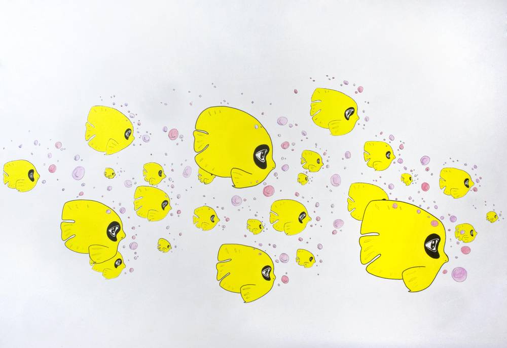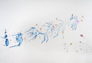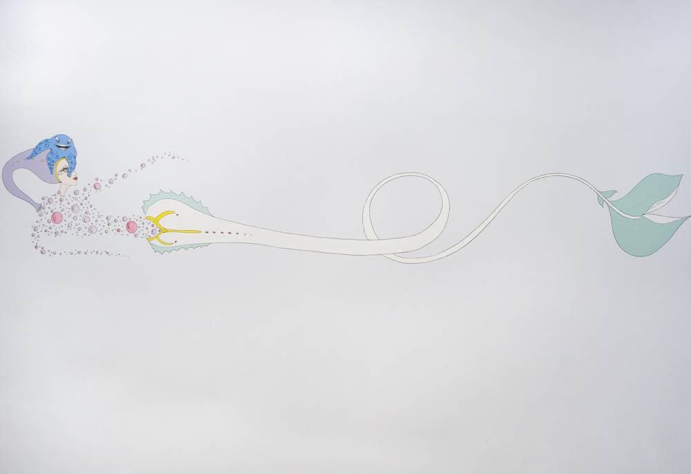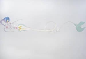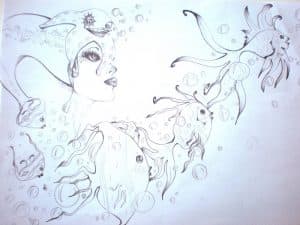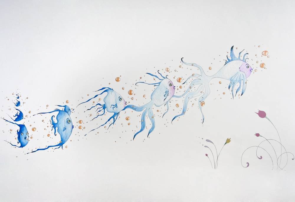 L’acqua è stata considerata dall’artista nella sua accezione più alta, ovvero come fonte di vita. In effetti il mare immaginato da Baldini risulta ricco di pesci colorati, pesci surreali, crostacei, sirene, bolle e flora marina.