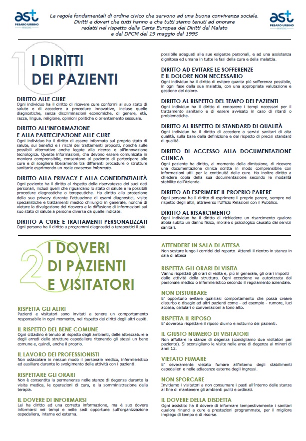 Le regole fondamentali di ordine civico che servono ad una buona convivenza sociale. Diritti e doveri che tutti hanno e che tutti siamo tenuti ad onorare redatti nel rispetto della Carta Europea dei Diritti del Malato e del DPCM del 19 maggio del 1995.